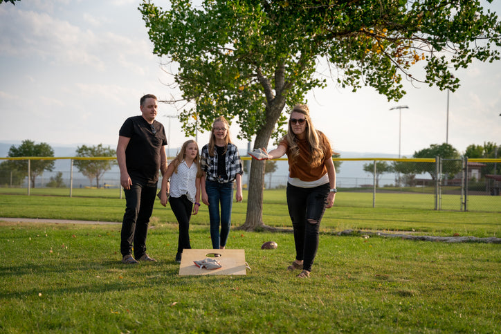 Players will alternate throwing their 4 bags down to the board on the other end - Throwing out of turn or outside the throwing box is a foul. The bag that was thrown when the foul occurred does not count and is immediately removed from play.