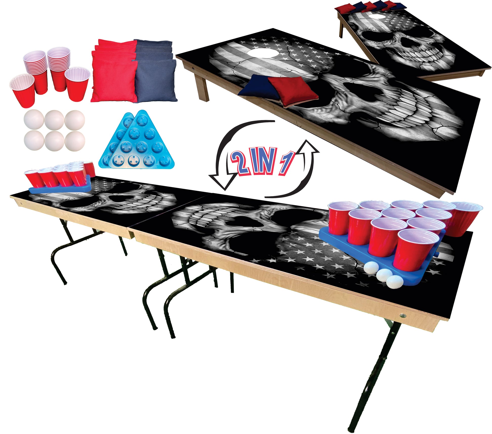 ⭐INCLUDES - (8) High Quality Double Stitched Cornhole Bags (6) Five Star Pong Balls (20 Cups +2 Wash Cups) (2) Premium Drink Pong Racks (1) 8Ft. Pong Table (2) 4x2Ft. Cornhole Boards