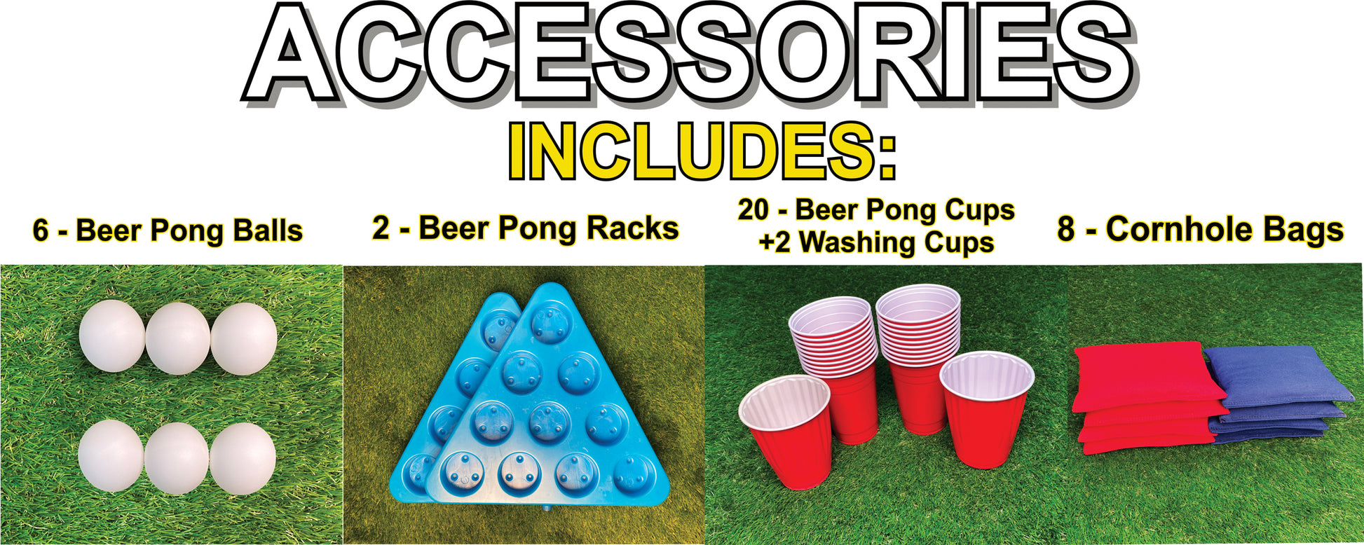 ⭐INCLUDES - (8) High Quality Double Stitched Cornhole Bags (6) Five Star Pong Balls (20 Cups +2 Wash Cups) (2) Premium Drink Pong Racks (1) 8Ft. Pong Table (2) 4x2Ft. Cornhole Boards