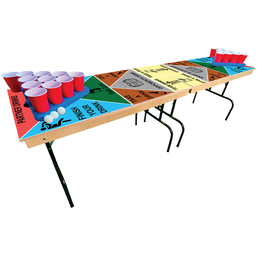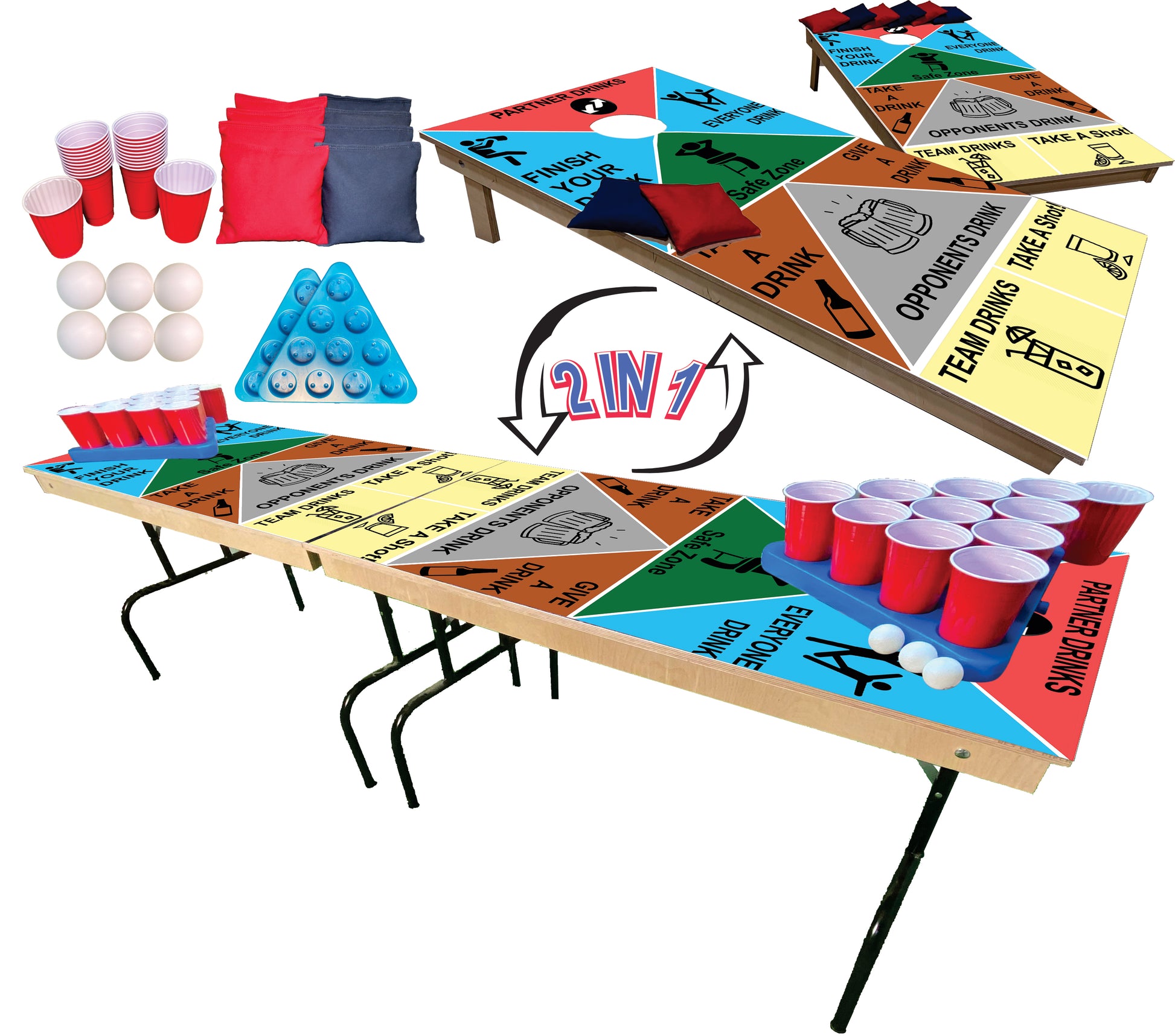 ⭐INCLUDES - (8) High Quality Double Stitched Cornhole Bags (6) Five Star Pong Balls (20 Cups +2 Wash Cups) (2) Premium Drink Pong Racks (1) 8Ft. Pong Table (2) 4x2Ft. Cornhole Boards