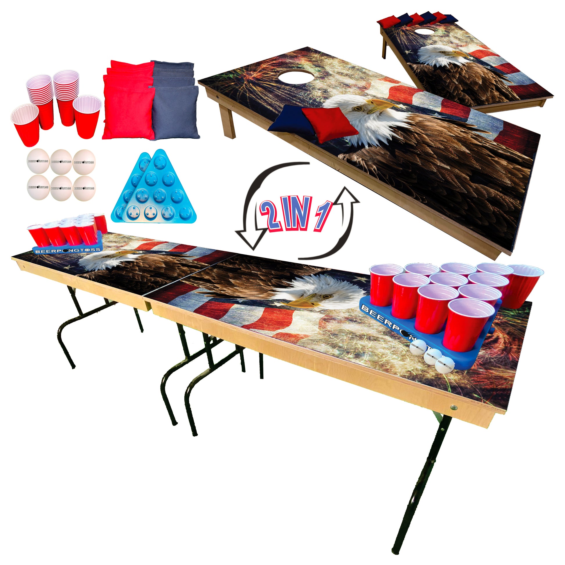 Introducing BeerPongToss: the ultimate 2-in-1 game that combines the best of cornhole and beer pong into one high-quality, all-American table! Crafted with precision in the USA, BeerPongToss promises hours of entertainment for friends and family.